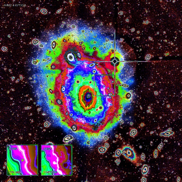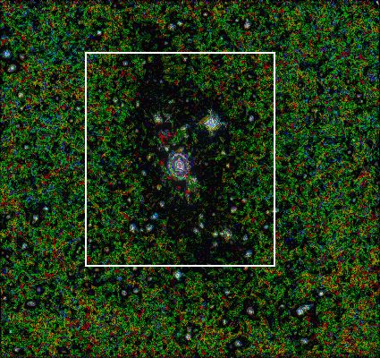 More detailed view of Abell 1795 (white rectangle in above picture) shows how galaxies stream from south towards the centre and ejected outwards from the centre towards north.
