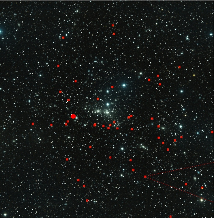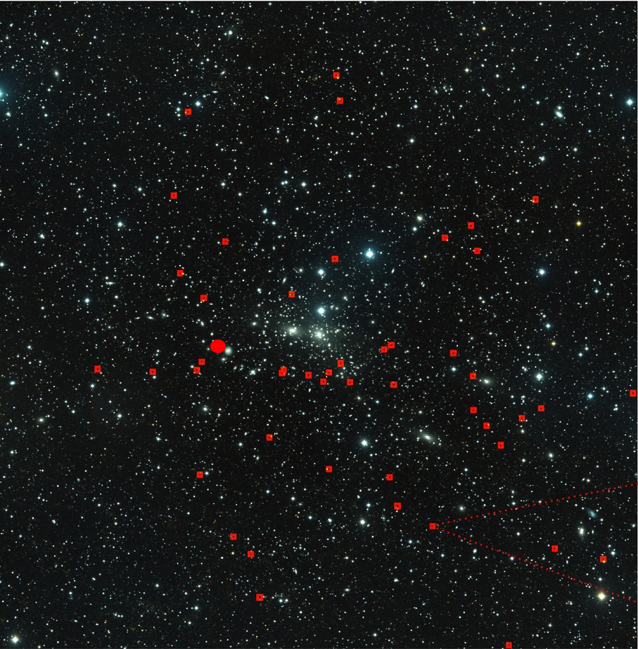 Positions of dark galaxies (red squares) around Coma cluster and the position of the centre of the dark structure (red dot) from where the dark objects seem to come out and flow following the structures of the hidden world.