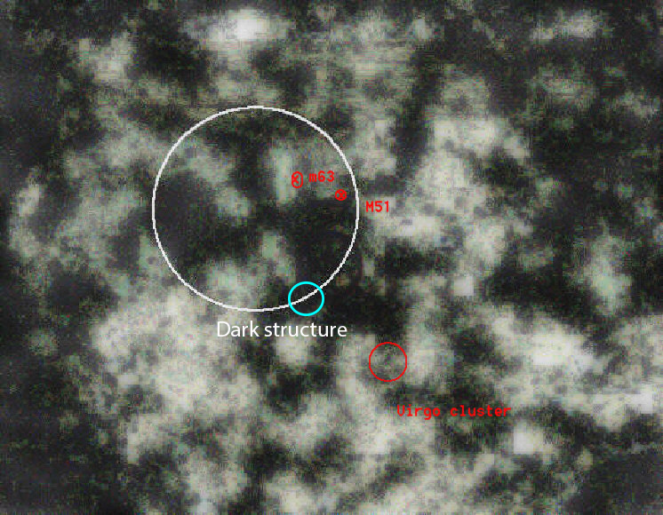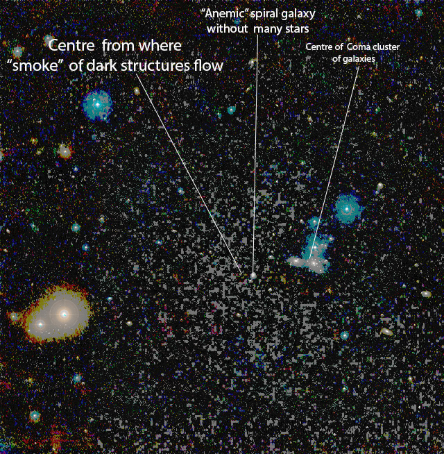 Inside the blue ring (above image) showing Coma cluster to the left and the centre of the dak structure from where dark bodies flow.