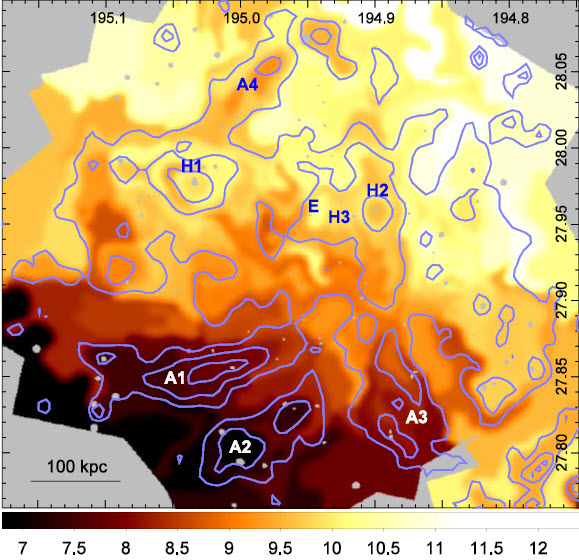 Temperature map of Coma cluster: Cooler streams from south-east and hotter ejections towards north-west.