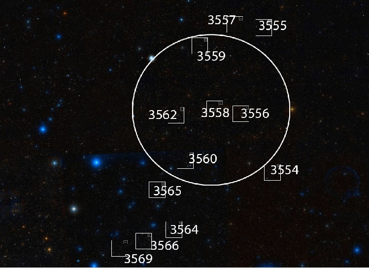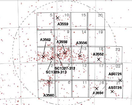 The positions of the richer galaxy clusters in Shapley supercluster is marked. The numbers are numbers of the clusters in Abell catalogue. The core part of the supercluster, centred around Abell3558 cluster, is marked with a circle.