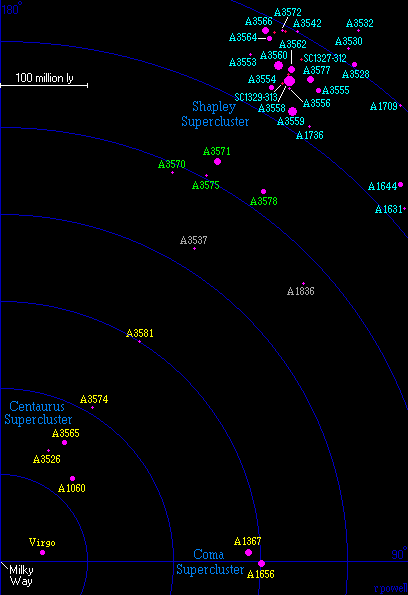 Three clusters of galaxies in the central part of the Shapley supercluster are more rich in galaxy content than the very rich Coma cluster. The central area of the Shapley supercluster which contains many clusters of galaxies are shown in the figure 13. The sky dips towards the South Galactic hemisphere as it crosses the Milky way arm separating the North and the South Galatic regions. The gas and dust in the Milky way arm makes it difficult to see the region immediately beyond the Shapley supercluster where the “Great Attractor” is believed to exist.